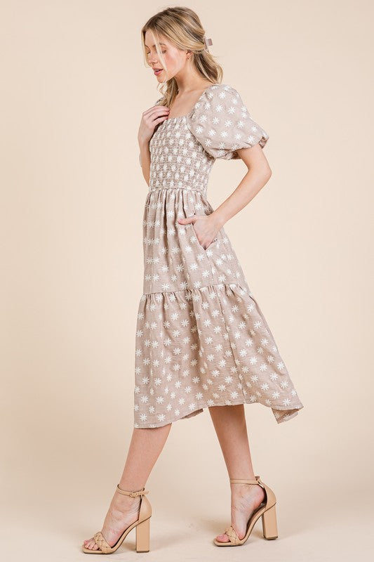 Floral Embroidered Smocked Puff Sleeve Tiered Midi Dress