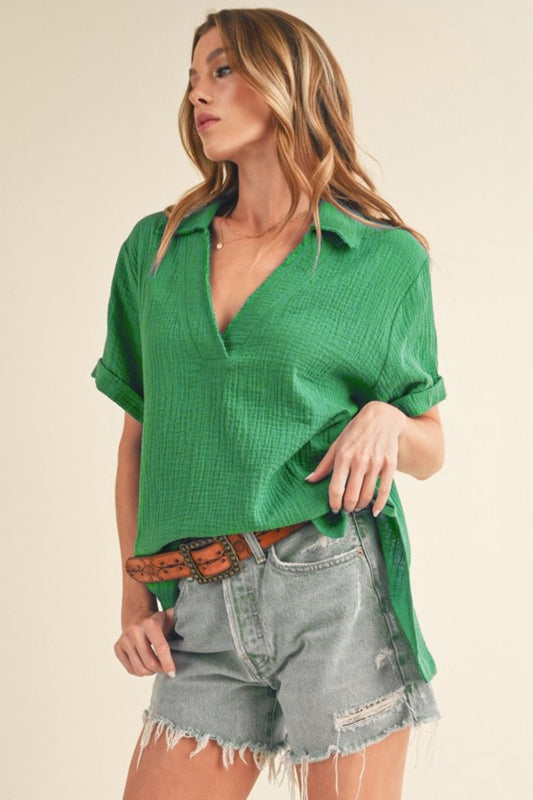 Side Slit Johnny Collar Short Sleeve Cotton Blouse