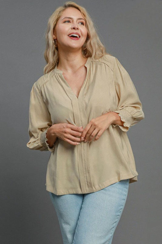 Full Size Notched Smocked Cuff Woven Top Plus Size